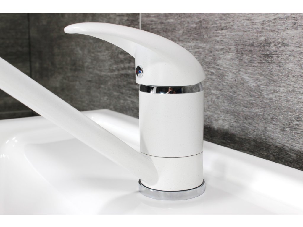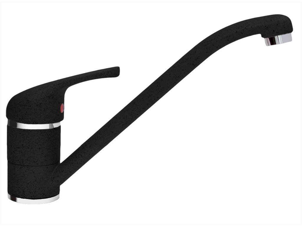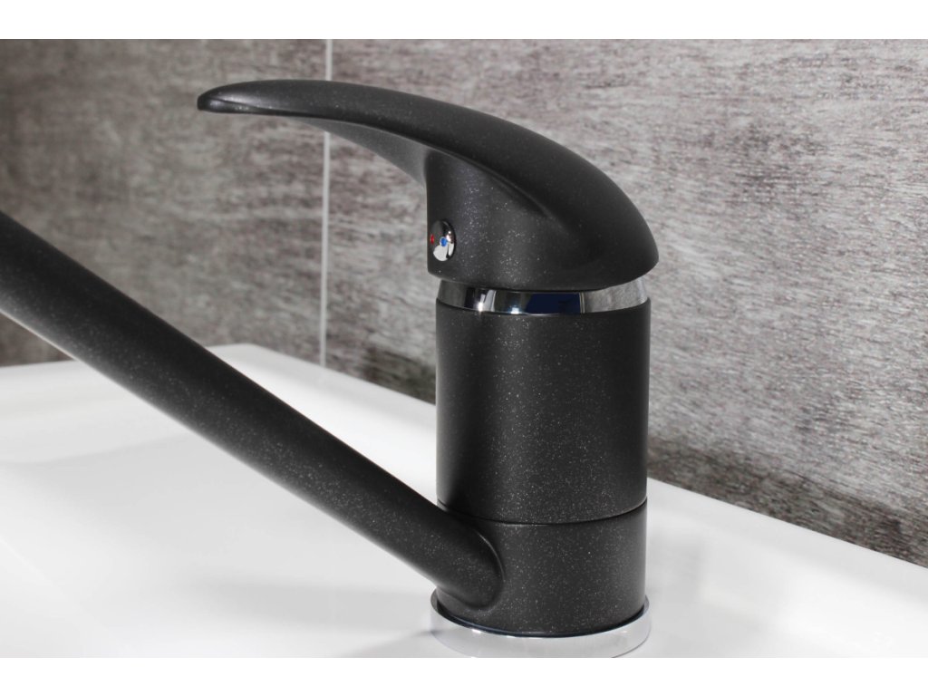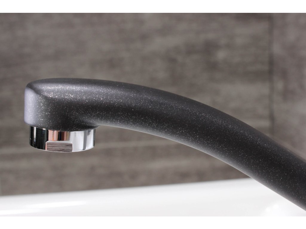 Povrch dřezové baterie je vyroben z drcené žuly. Černá granitová baterie, ale také písková, bílá nebo šedá skvěle doplní granitový dřez v podobných odstínech. Samozřejmě je možné tuto pákovou baterii použít i u dřezů nerezových, kde ozvláštní celkový dojem mycího centra.