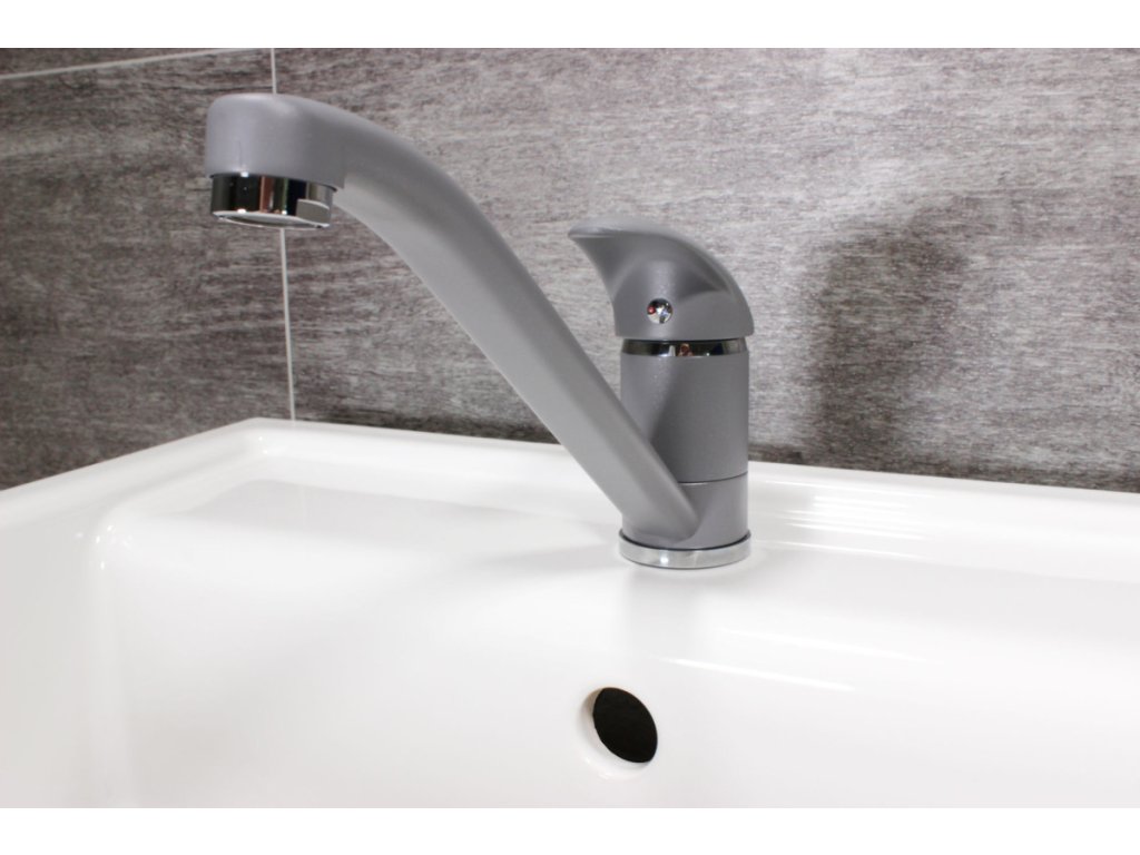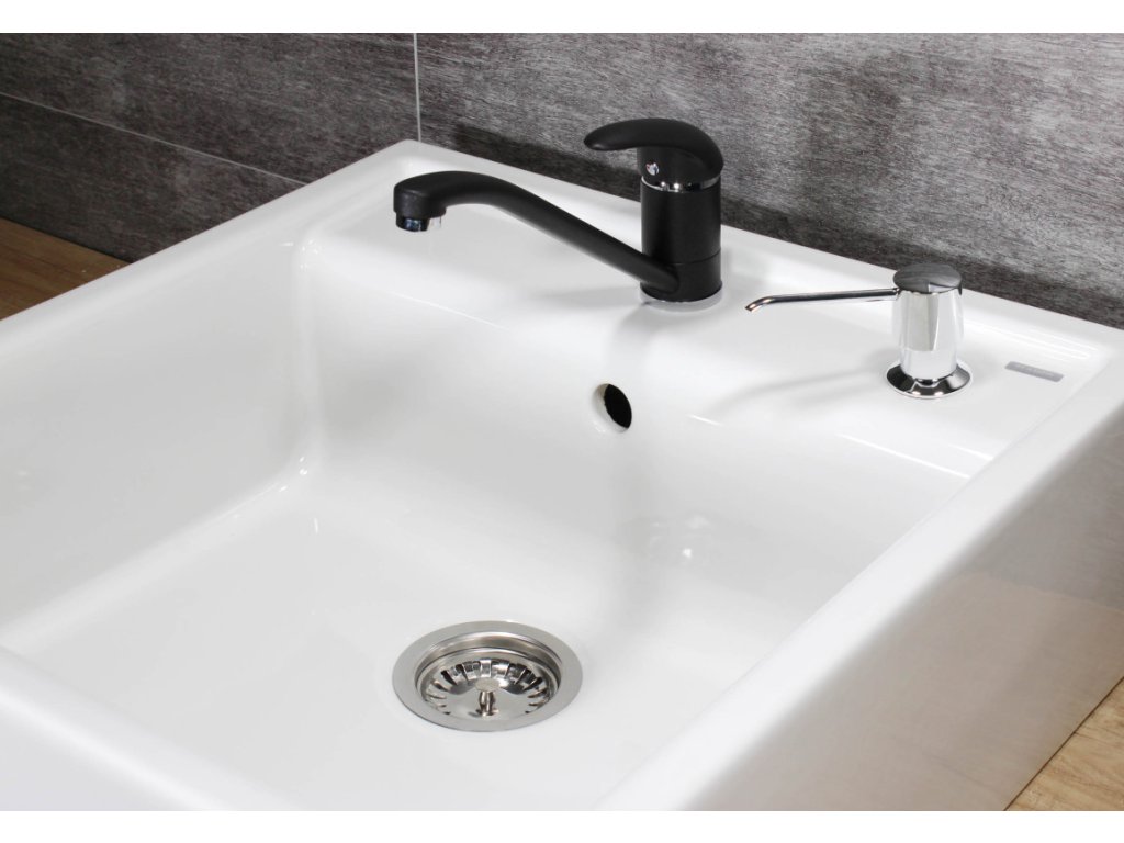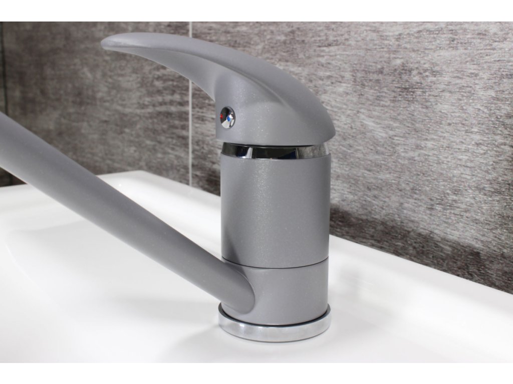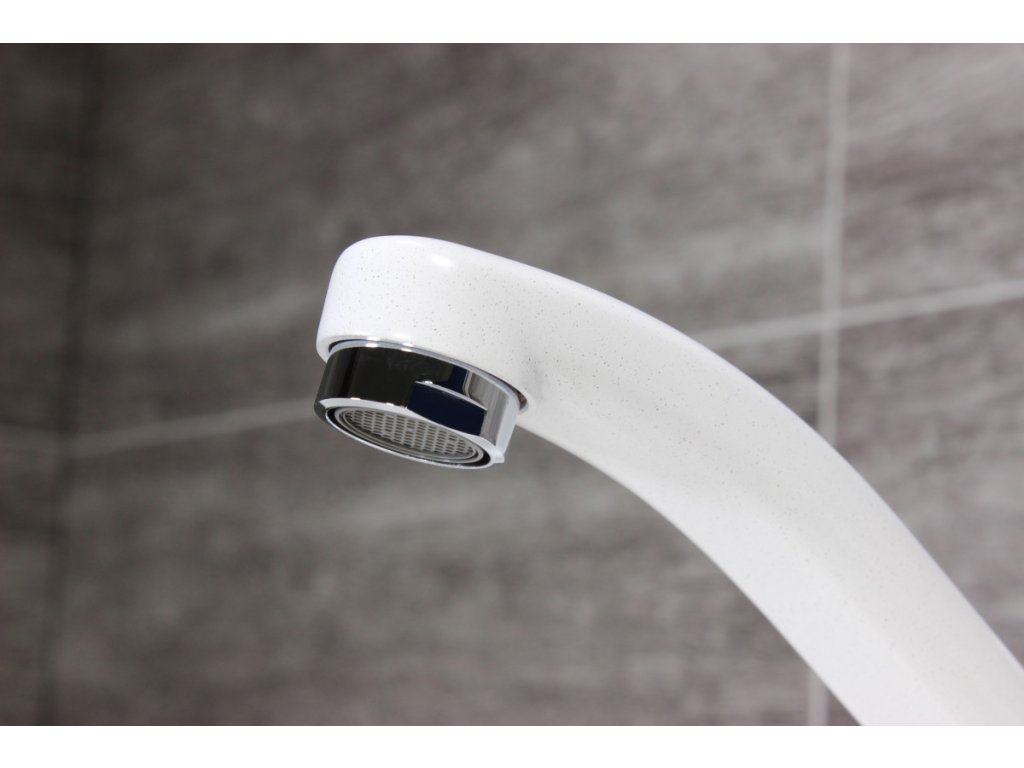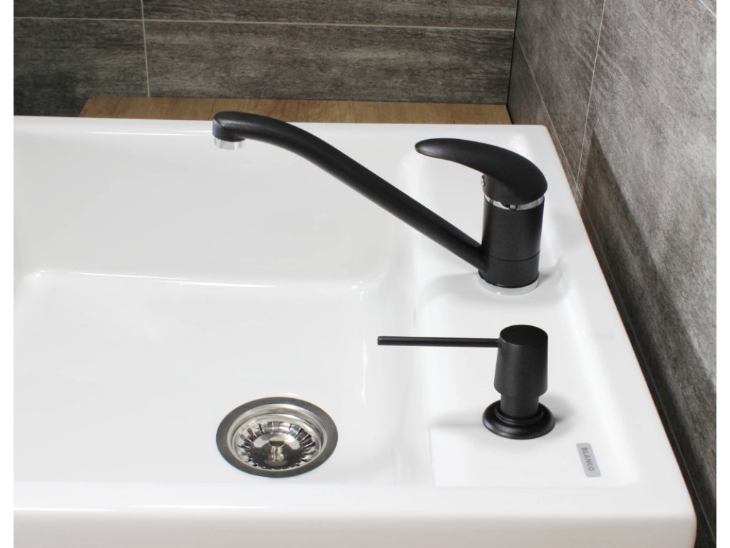 Povrch dřezové baterie je vyroben z drcené žuly. Černá granitová baterie, ale také písková, bílá nebo šedá skvěle doplní granitový dřez v podobných odstínech. Samozřejmě je možné tuto pákovou baterii použít i u dřezů nerezových, kde ozvláštní celkový dojem mycího centra.