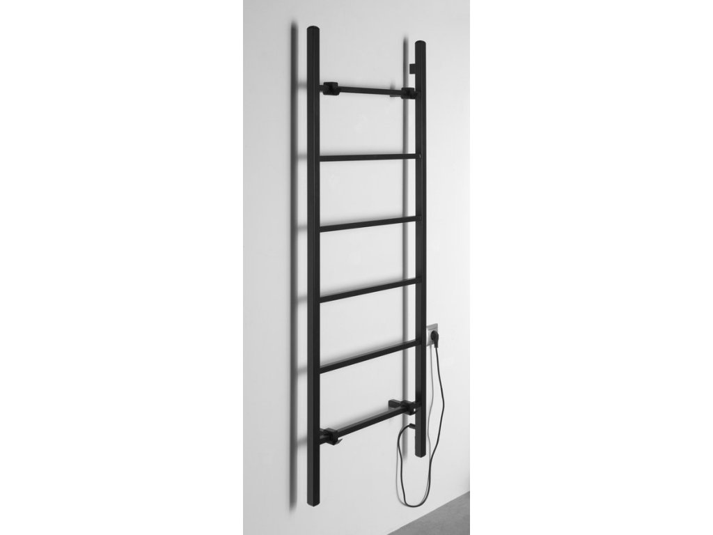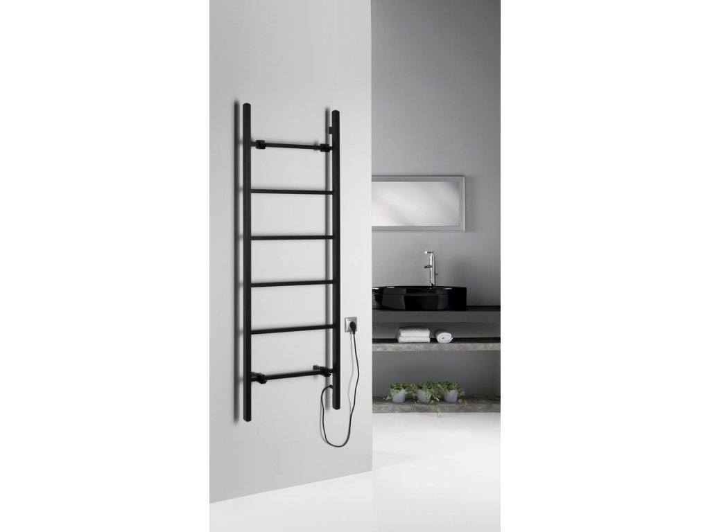 Černý el. topný žebřík, který lze zavěsit, nebo jednoduše opřít o stěnu. Matný černý povrch.