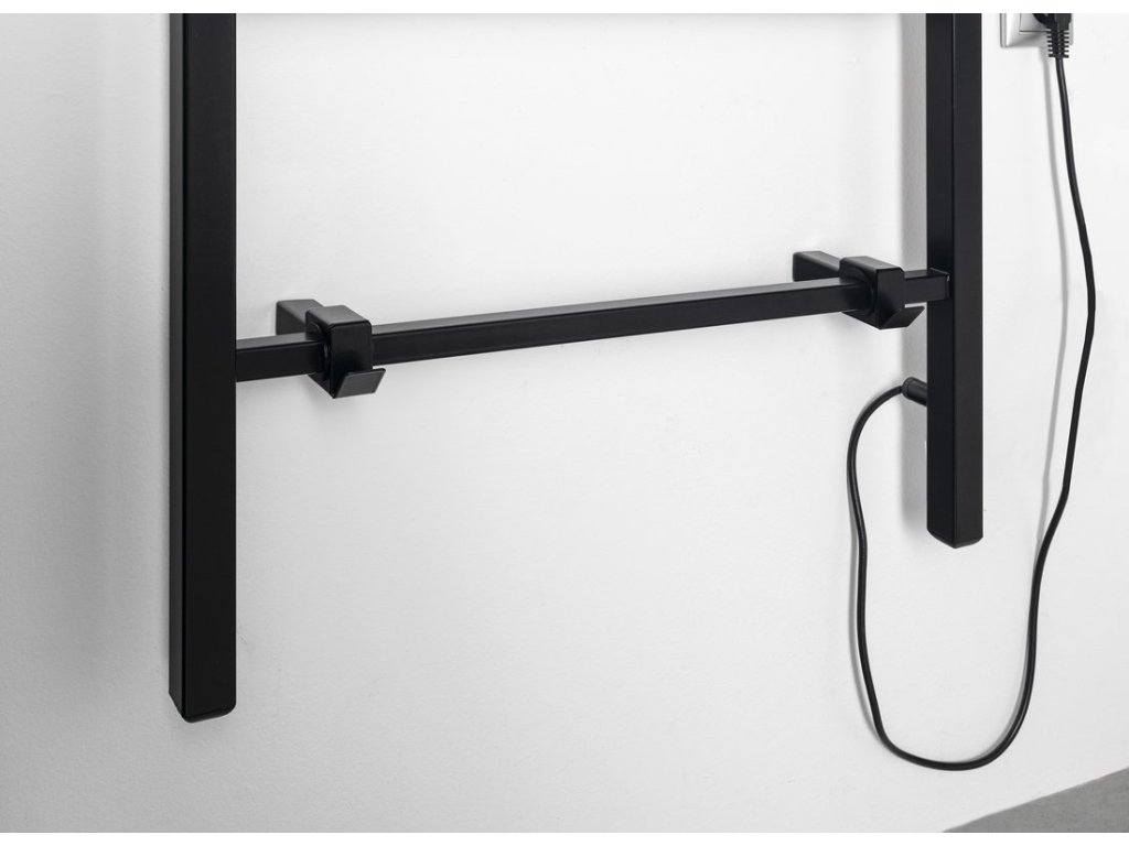 Černé matné otopné těleso do koupelny, stačí jednoduše zavěsit na zeď a připojit do el. Zásuvky.