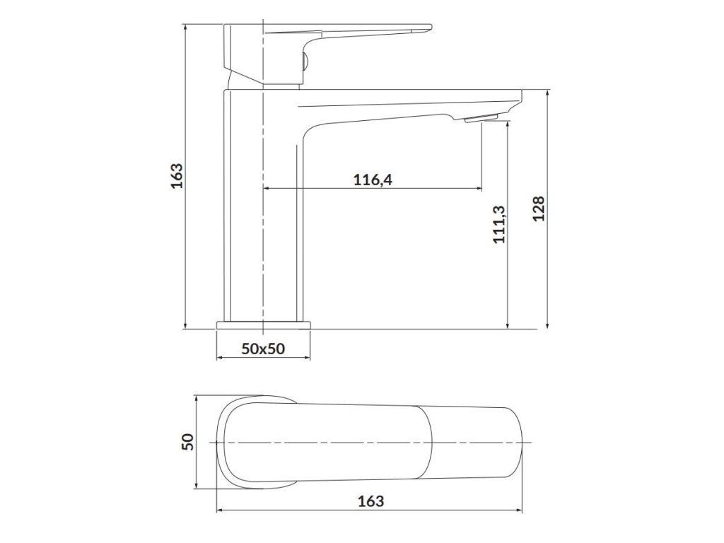 Kombinace válcového těla s hranatou hubicí u umyvadlové baterie