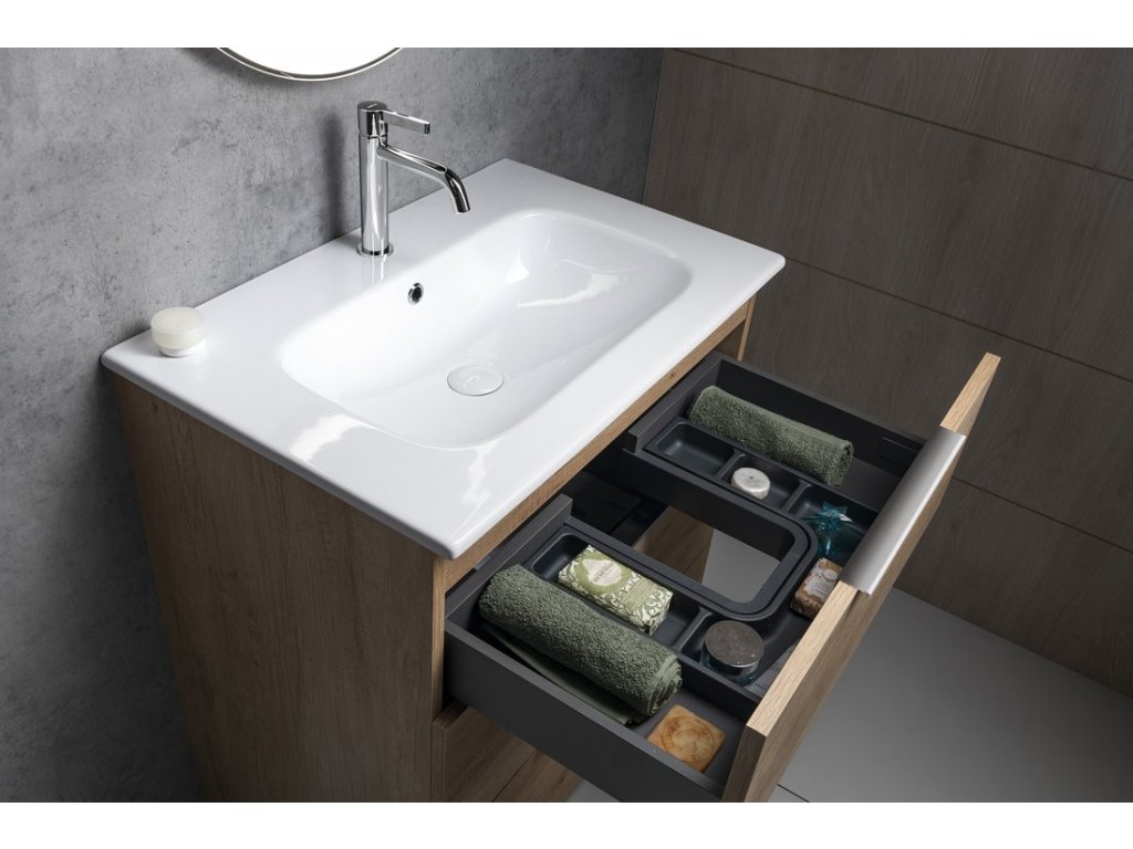 Velkou výhodou je možnost objednání praktických organizérů a misek LINDO pro uložení předmětů každodenní potřeby do horní i spodní zásuvky. Zásuvky jsou vybaveny výsuvy s pomalým dojezdem a automatickým dovřením, dvířka mají kování s tlumeným dovíráním. Úložný prostor lze rozšířit přidáním doplňkových skříněk ESPACE.