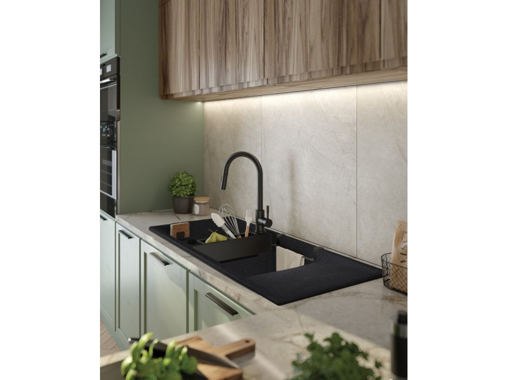 Magnetický granitový dřez je velmi důmyslným řešením. Díky zabudovaným magnetům a ocelové mřížce lze pro zvýšení funkčnosti využít část boční police. Je dobře známo, že mikroorganismy se v suchém prostředí nevyvíjejí příliš rychle, a proto nabízíme také speciální doplňkové příslušenství. Příbory můžete vkládat do přiléhavých košíčků s prolamovaným dnem a na rukojeti pověsit hadřík nebo kuchyňskou drátěnku, aby odkapaly. Magnetický granitový dřez je odolný proti zabarvení, nárazům a vysokým teplotám v souladu s evropskou normou PN-EN 13310. Unikátní, 2komorový dřez s odkapávačem je určen do prostornějších kuchyní, kde lze vyčlenit více prostoru. mokrá zóna. K pohodlným dvěma komorám přibyl praktický odkapávač, který dává široké možnosti při mytí nádobí a přípravě pokrmů. Funguje také jako sušička a profilovaný povrch účinně odvádí vodu.