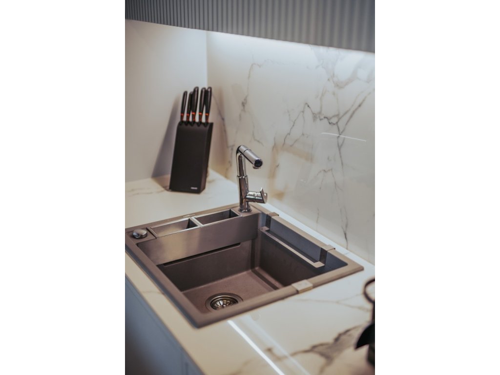 Magnetický granitový dřez je velmi důmyslným řešením. Díky zabudovaným magnetům a ocelové mřížce lze využít část boční police pro zvýšení využitelnosti. Je dobře známo, že mikroorganismy se v suchém prostředí nevyvíjejí příliš rychle, a proto nabízíme také speciální doplňkové příslušenství. Příbory můžete vkládat do přiléhavých košíčků s prolamovaným dnem a na rukojeti pověsit hadřík nebo kuchyňskou drátěnku, aby odkapaly. Magnetický granitový dřez je odolný proti zabarvení, nárazům a vysokým teplotám v souladu s evropskou normou PN-EN 13310. Úhledný dřez s 1 mísou je perfektním řešením pro malé kuchyně a garsoniéry s kuchyňským koutem.