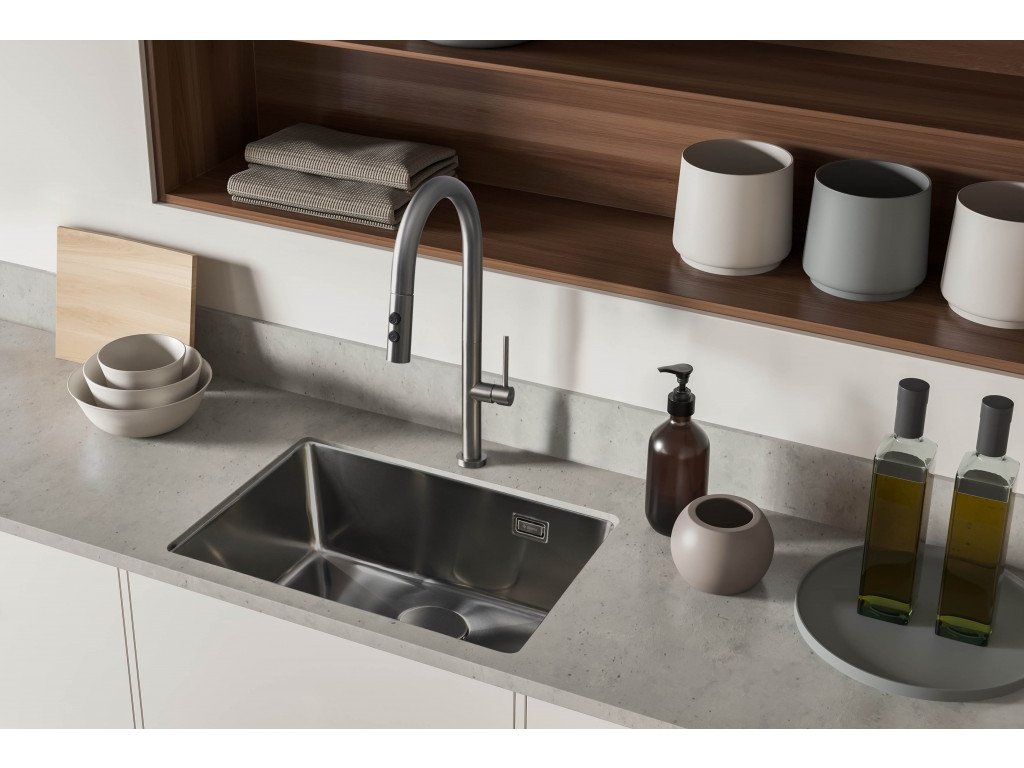Funkční kuchyňská baterie byla navržena s ohledem na vysokou použitelnost a estetický vzhled. Díky elegantnímu designu se hodí do moderních, ale i skandinávských či tradičnějších interiérů. Dřezová baterie má perlátor, který snižuje životnost vody, což je velmi důležité při ručním mytí nádobí. Provzdušňovaný proud je navíc měkčí. Výlevku lze navíc vytáhnout na dlouhou a ohebnou hadici, což usnadňuje oplachování velkých a podměrečných předmětů, například plechu na pečení z trouby nebo police z chladničky. Baterie má přepínač průtoku vody z provzdušňované na dešťovou vodu.