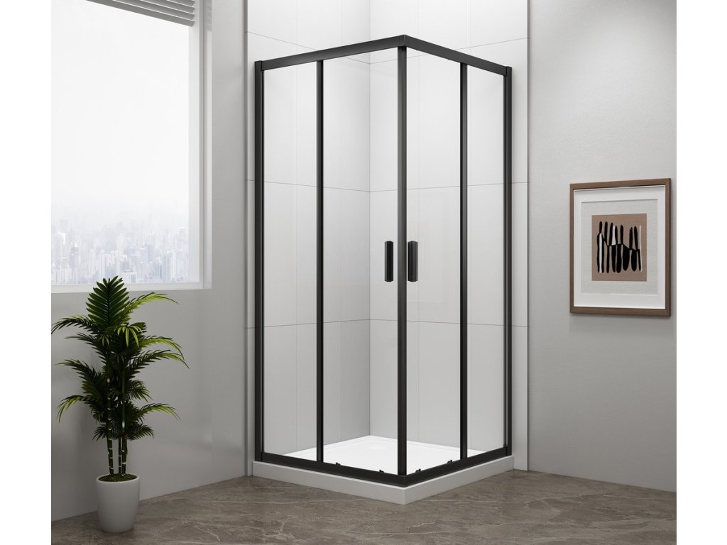 - Čtvercové zástěny s dvoudílnými posuvnými dveřmi, rohový vstup