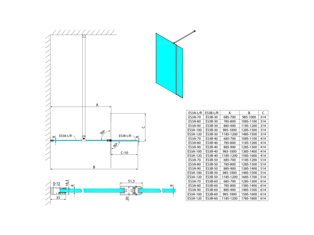 - Fixní sklo pro připojení přídavného otočného panelu v šířkách 700 až 1200 mm a přídavný otočný panel v šířkách 300 až 600 mm