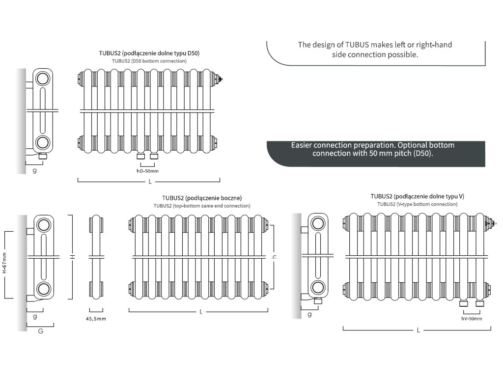 Radiátor je dodáván jak s bočním, tak i se spodním připojením D50. U spodního D50 je připojení standardně umístěno ve středu radiátoru, ale lze i případně nechat vyrobit s umístěním na pravé nebo levé straně radiátoru (nutno uvést do objednávky)