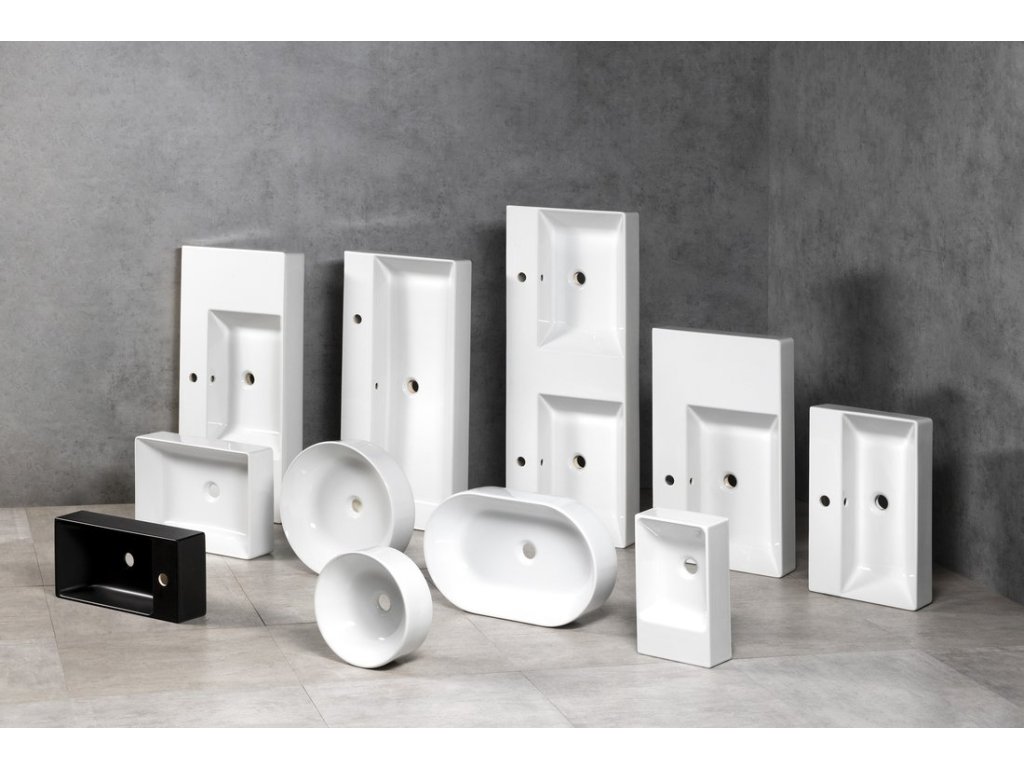 - masivní hranatá umyvadla s praktickými odkládacími plochami