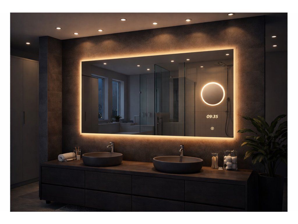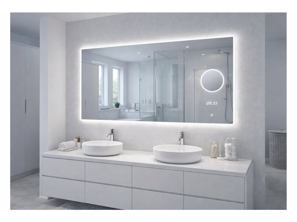 Model SELECT v šířce 120 cm představuje vrchol komfortu pro moderní koupelnové interiéry. Velká zrcadlová plocha opticky zvětšuje prostor a poskytuje ideální zázemí pro ranní hygienu i večerní relaxaci. Součástí skla jsou precizně vybroušené digitální hodiny a integrovaná lupa s 5násobným zvětšením, která je rovněž vybavena vlastním podsvícením.