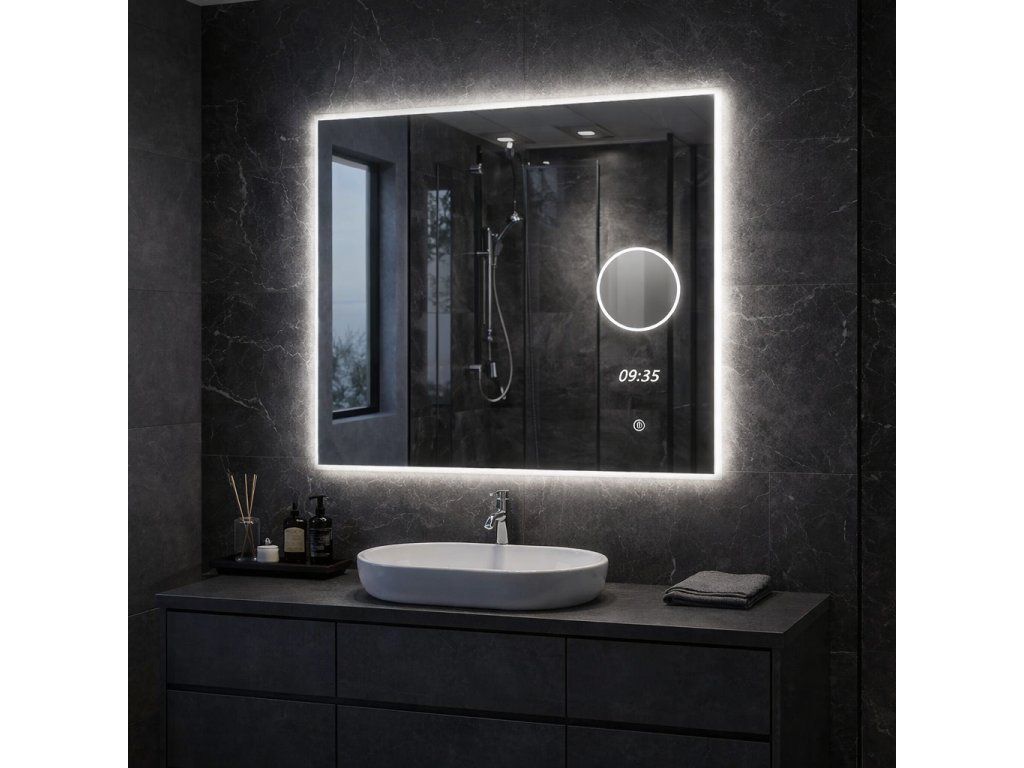 Model SELECT o rozměru 80x65 cm představuje ideální rovnováhu mezi velikostí a výbavou. Toto zrcadlo je osazeno diskrétními digitálními hodinami, díky kterým budete mít čas pod kontrolou i během ranního shonu. Hlavní předností je integrovaná podsvícená lupa s 5x zoomem, která zajistí dokonalé osvětlení obličeje bez nepříjemných stínů.