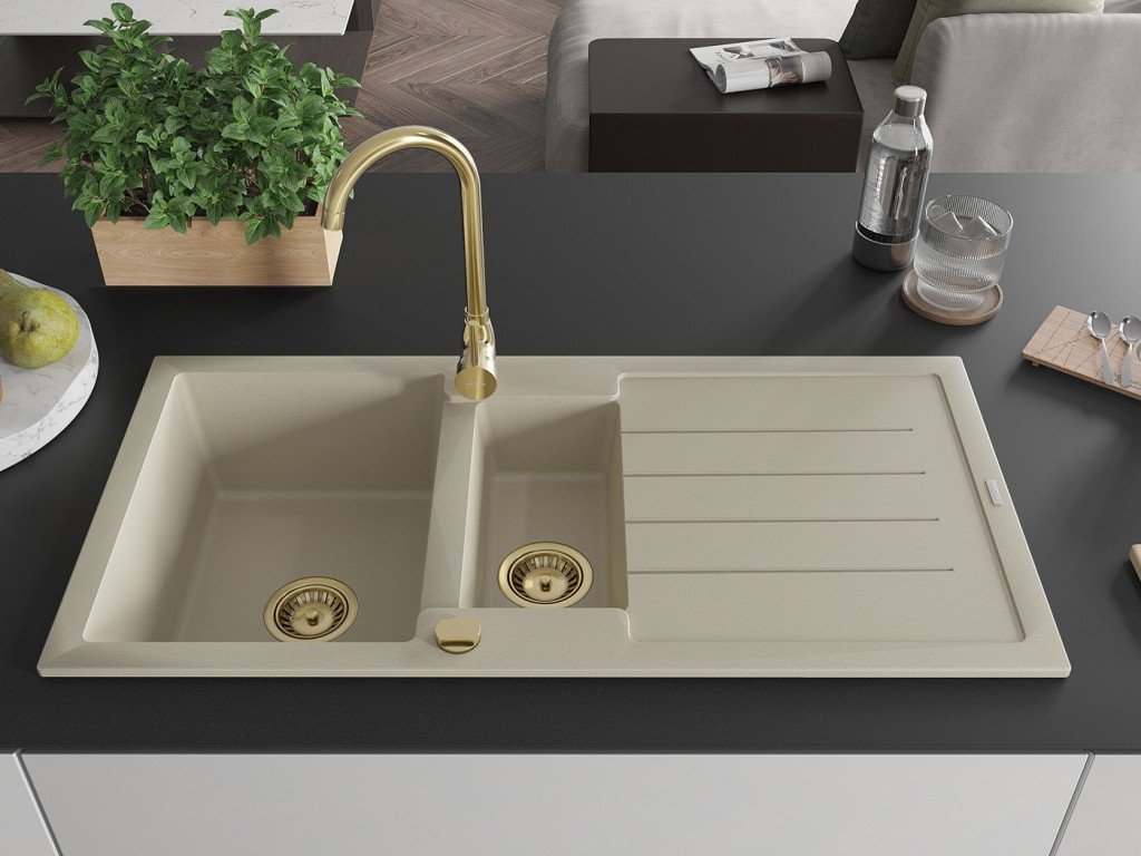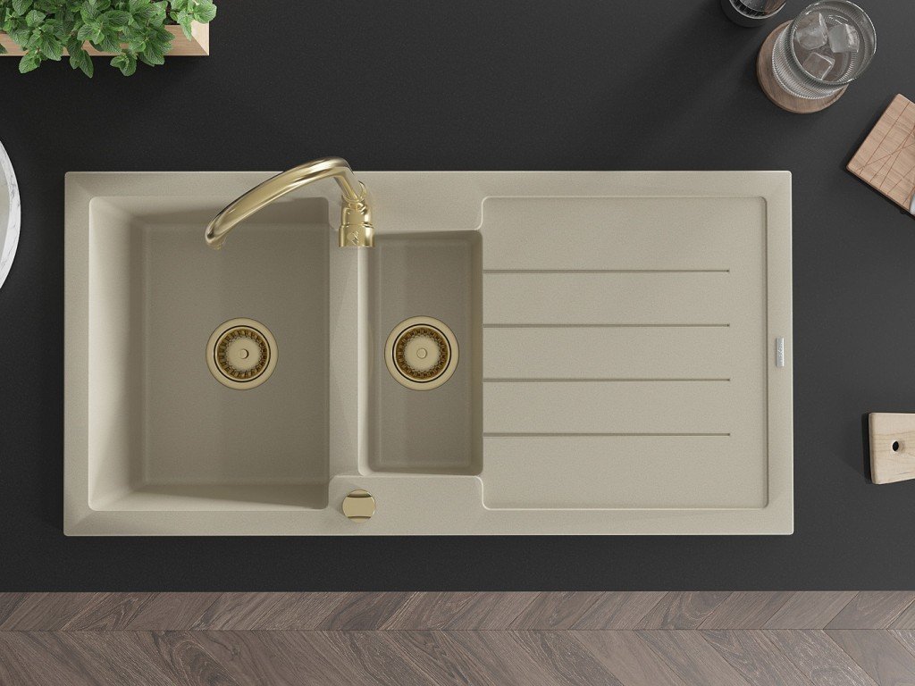 MEXEN/S - Andres granitový dřez s odkapávačem 1000 x 500 mm, béžová, zlatý sifon 6515101510-69-G