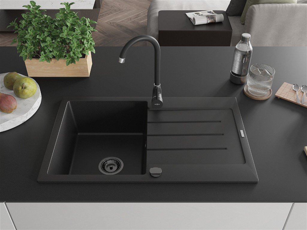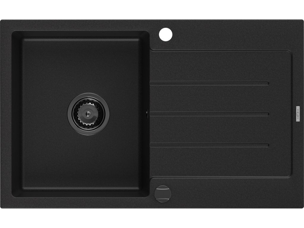 MEXEN/S - Bruno granitový dřez 1-miska s odkapávačem 795 x 495 mm, černý, černý sifon 6513791010-77-B