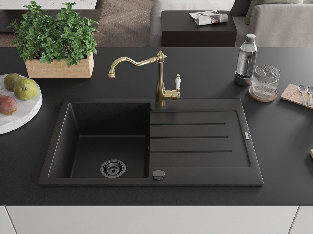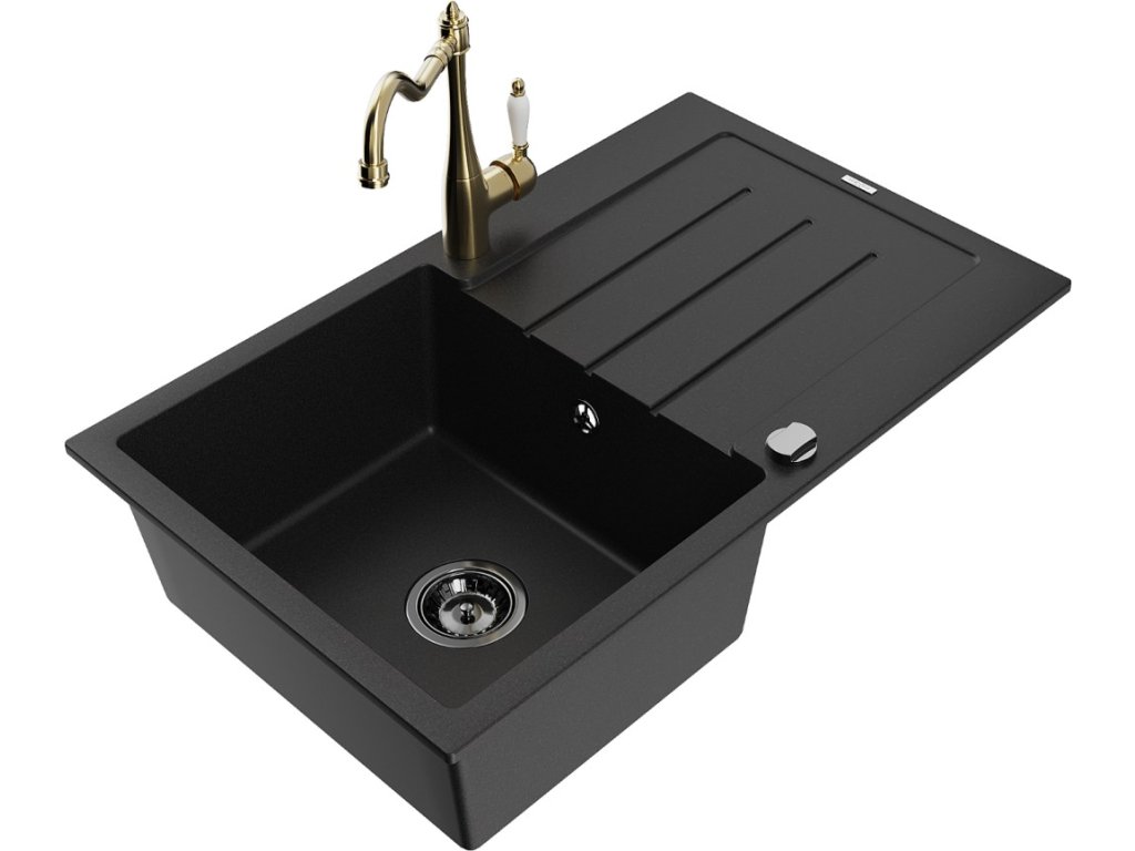 MEXEN/S - Bruno granitový dřez 1-miska s odkapávačem včetně baterie Carla, černá 6513-77-670700-50-B