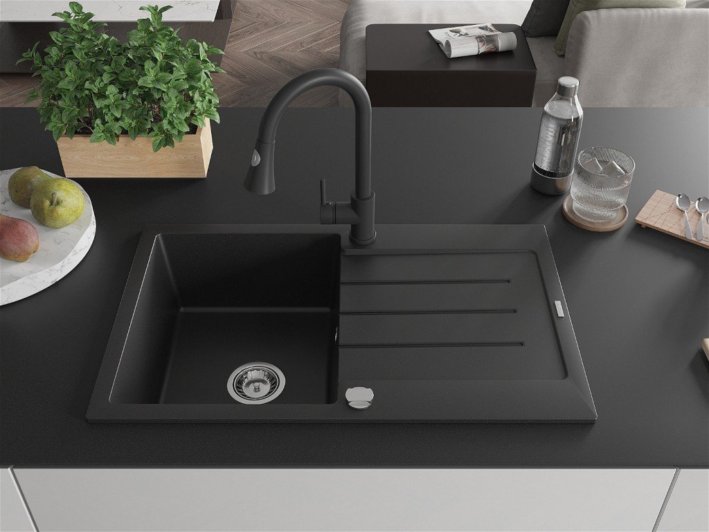 Kuchyňský granitový dřez odolný vůdči poškrábání, teplotním šokům a nárazům. Směs přírodní pryskyřice a hustého granitu.