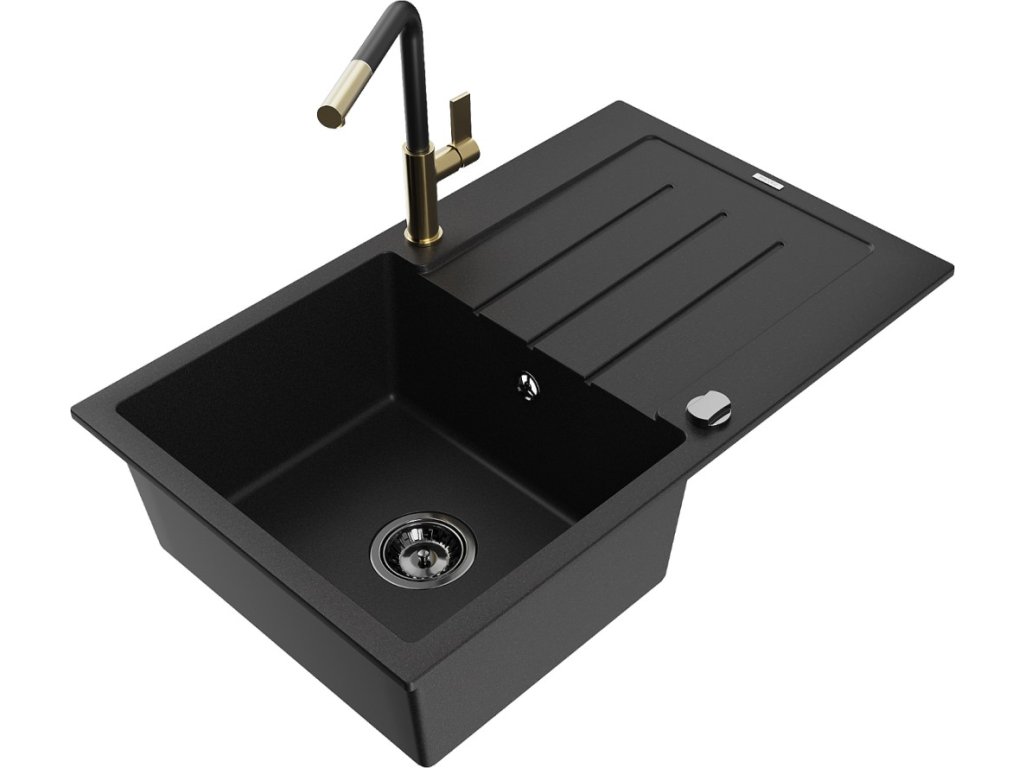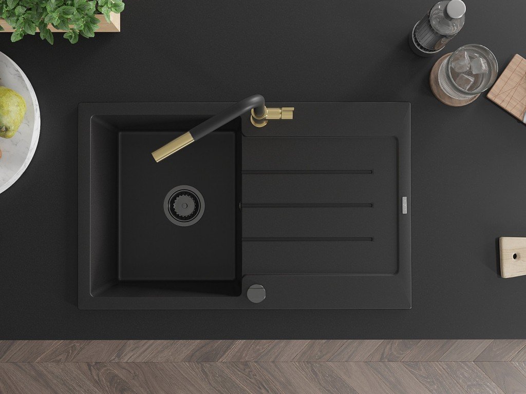 MEXEN/S - Bruno granitový dřez 1 s odkapávačem včetně baterie Flora, černá 6513-77-670401-57-B