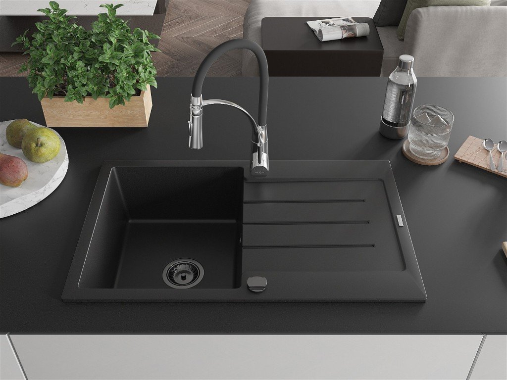 Kuchyňský granitový dřez odolný vůdči poškrábání, teplotním šokům a nárazům. Směs přírodní pryskyřice a hustého granitu.