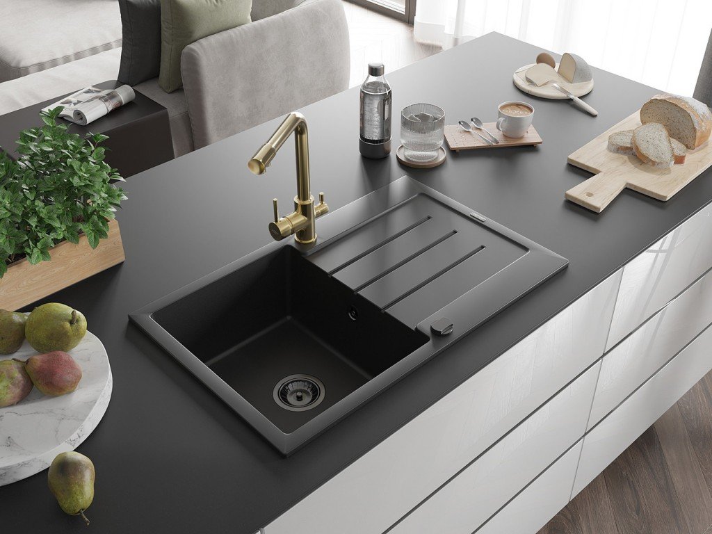 Kuchyňský granitový dřez odolný vůdči poškrábání, teplotním šokům a nárazům. Směs přírodní pryskyřice a hustého granitu.