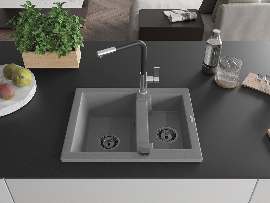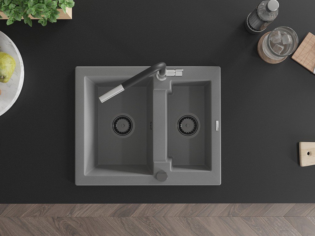 MEXEN/S - Carlos granitový dřez 1.5 včetně baterie Flora, šedá 6518-71-670401-07-B