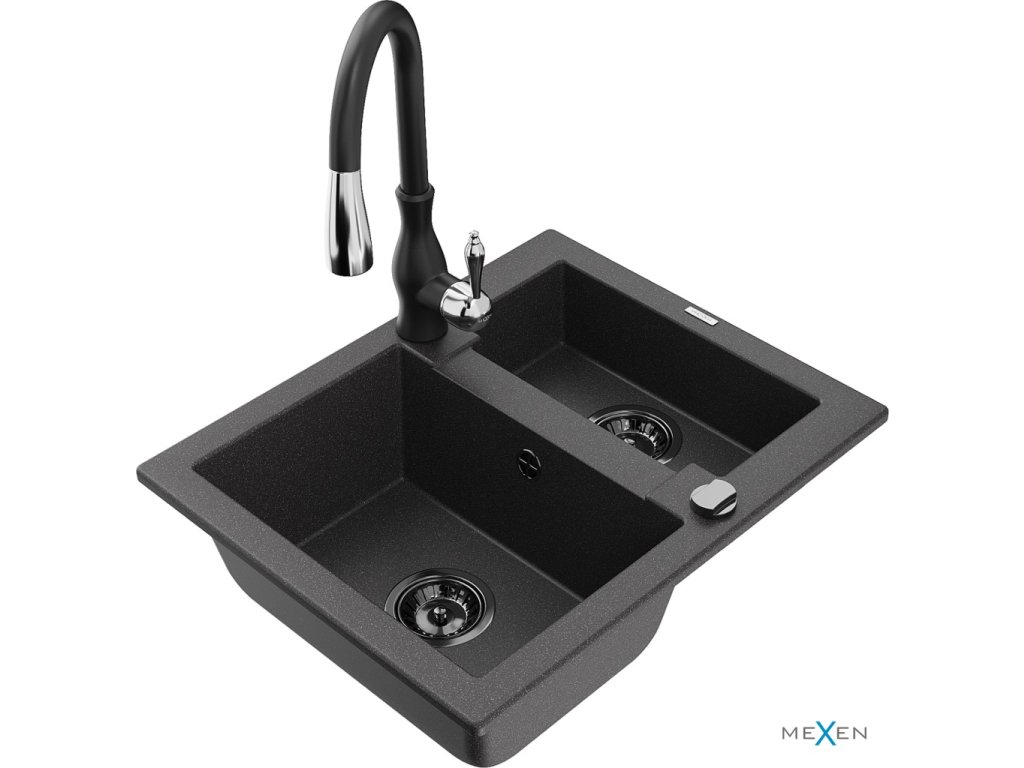MEXEN/S - Carlos granitový dřez 1.5 včetně baterie Savita, černá kropenatá 6518-76-672601-70-B