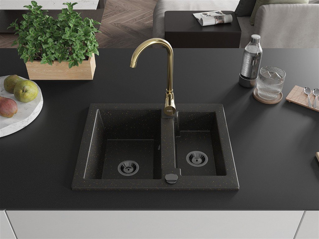 MEXEN/S - Carlos granitový dřez 1.5 včetně baterie Telma, černá/zlatá metalik 6518-75-670200-50-B