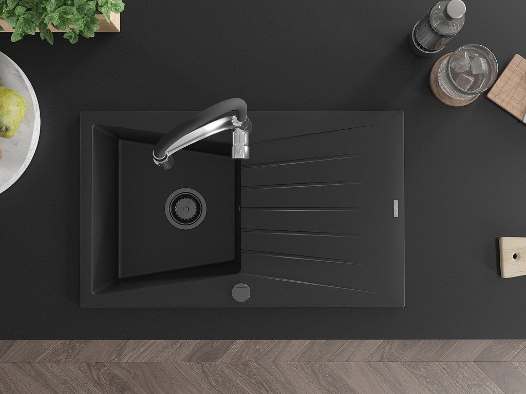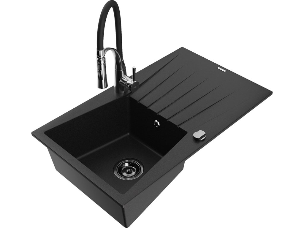 MEXEN/S - Cesar granitový dřez s odkapávačem včetně baterie Aster, černá 6514-77-73450-07-B