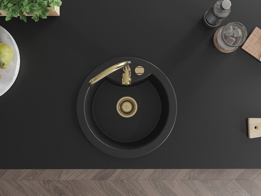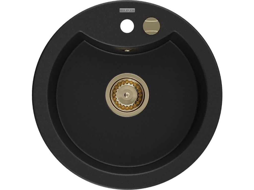 MEXEN/S - Diego granitový dřez 1-miska 488 x 480 mm, černý, zlatý sifon 6512481000-77-G