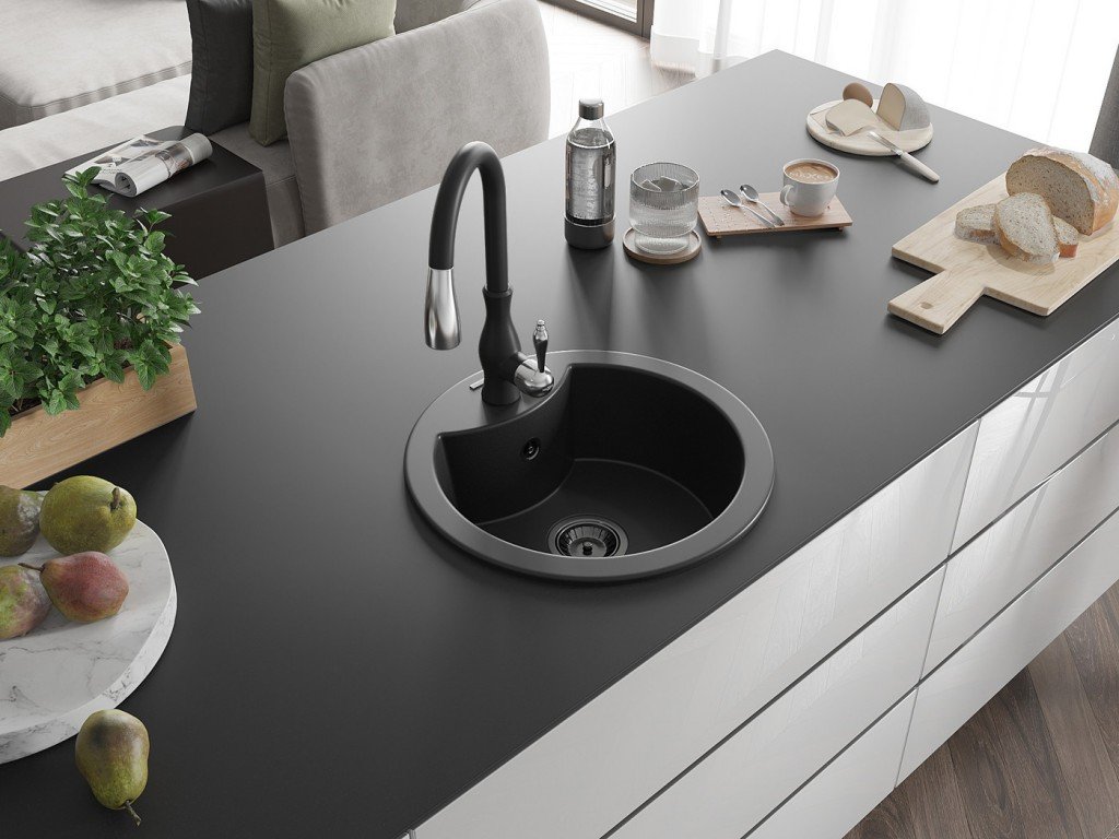 Kuchyňský granitový dřez odolný vůdči poškrábání, teplotním šokům a nárazům. Směs přírodní pryskyřice a hustého granitu.