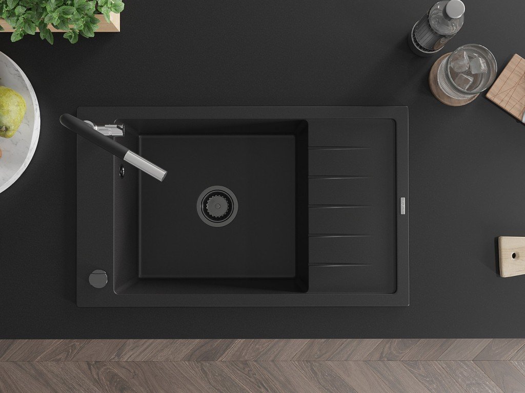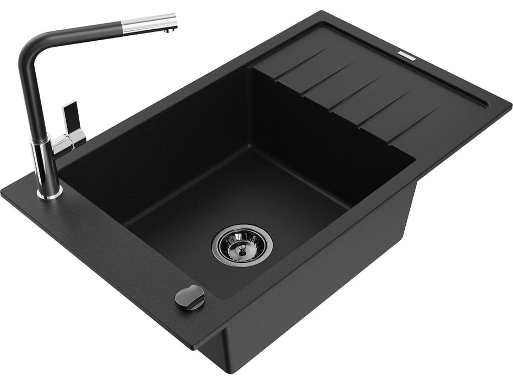 MEXEN/S - Elias granitový dřez 1 s odkapávačem včetně baterie Flora, černá 6511-77-670401-07-B