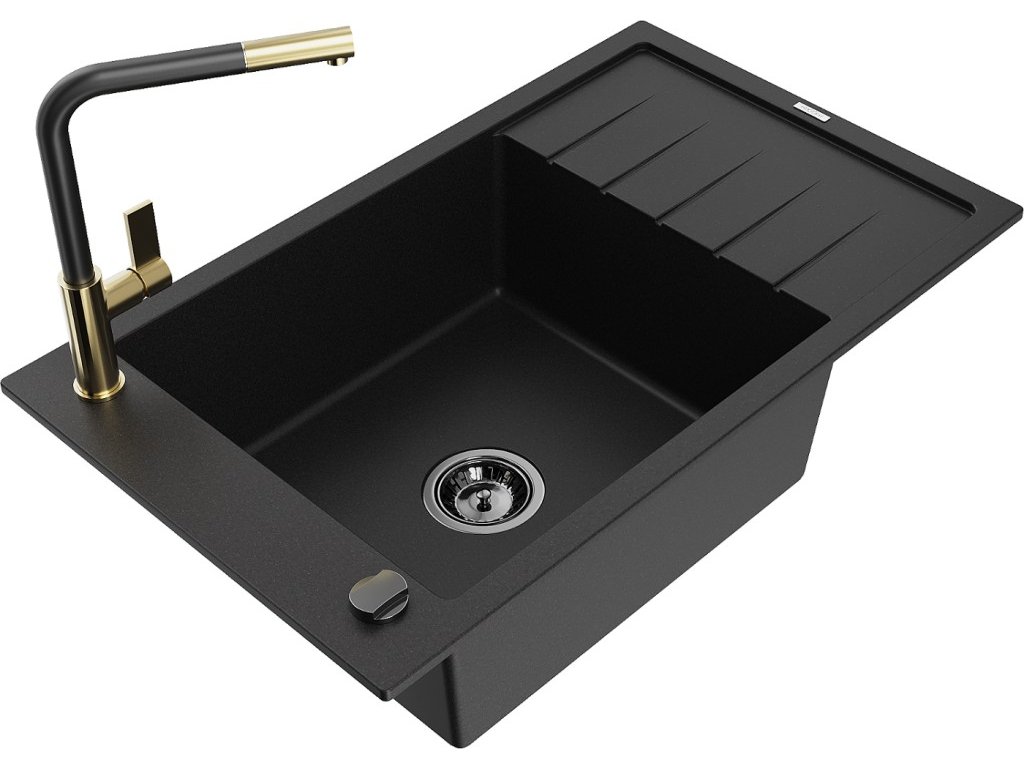 MEXEN/S - Elias granitový dřez 1 s odkapávačem včetně baterie Flora, černá 6511-77-670401-57-B