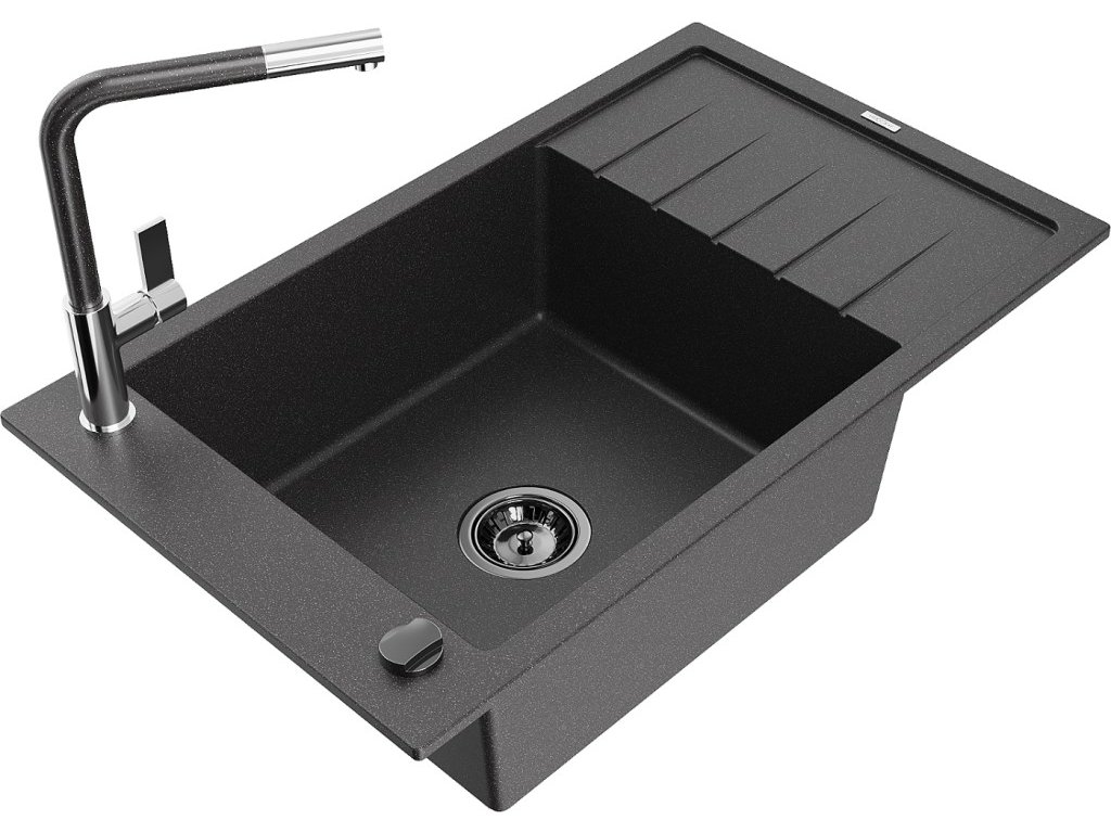 MEXEN/S - Elias granitový dřez 1 s odkapávačem včetně baterie Flora, černá kropenatá 6511-76-670401-08-B
