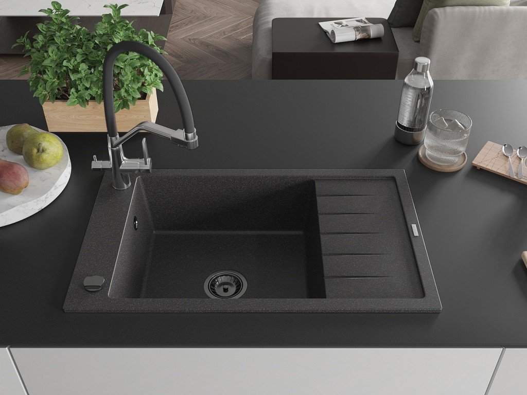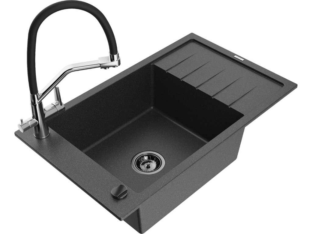 MEXEN/S - Elias granitový dřez s odkapávačem včetně baterie Duo, černá kropenatá 6511-76-671701-07-B