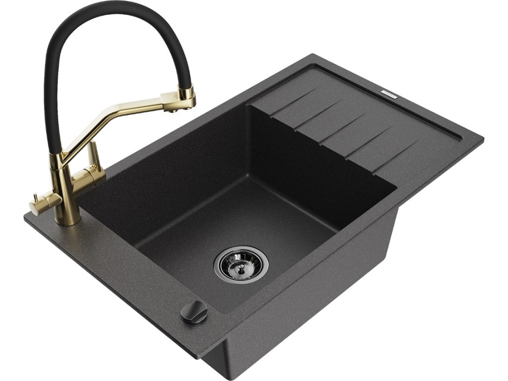 MEXEN/S - Elias granitový dřez s odkapávačem včetně baterie Duo, černá kropenatá 6511-76-671701-57-B