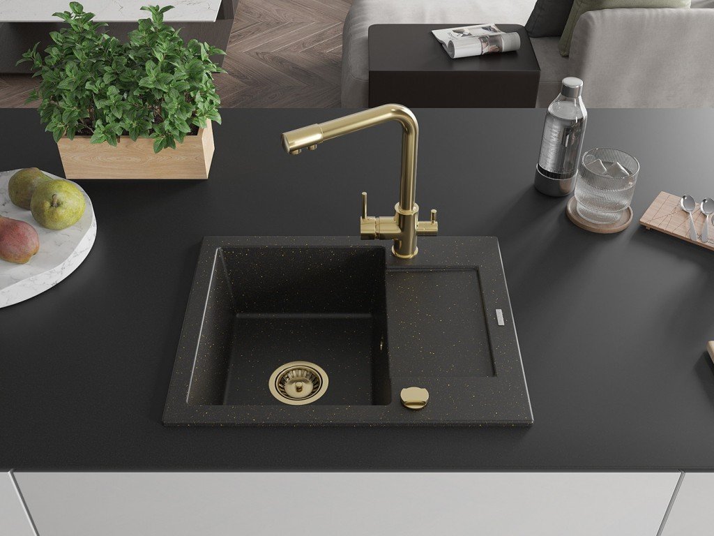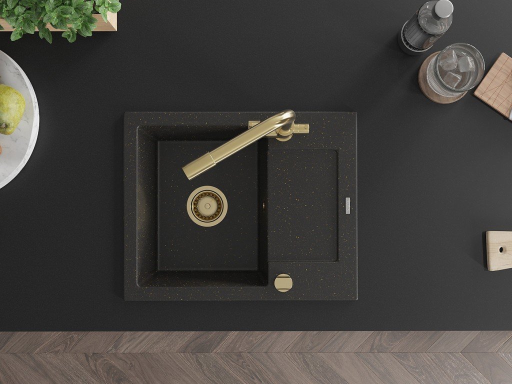 MEXEN/S - Enzo granitový dřez 1-miska s odkapávačem včetně baterie Duero, černá/zlatá metalik 6506-75-671600-50