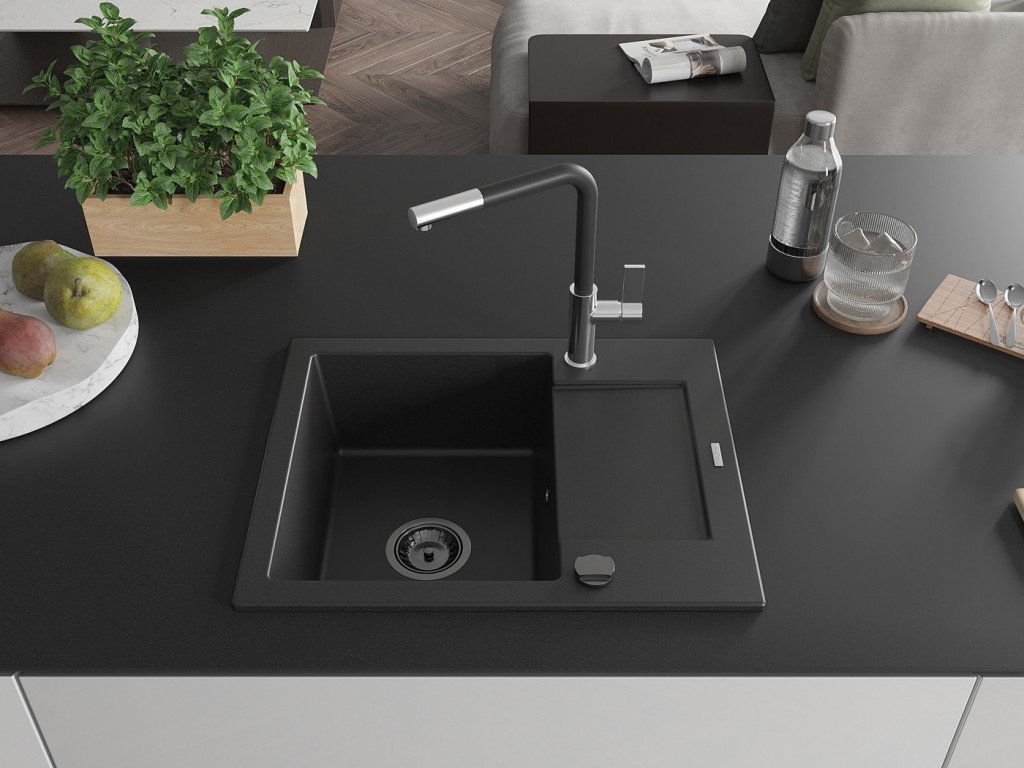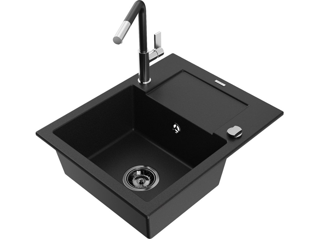 MEXEN/S - Enzo granitový dřez 1-miska s odkapávačem včetně baterie Flora, černá 6506-77-670401-07-B