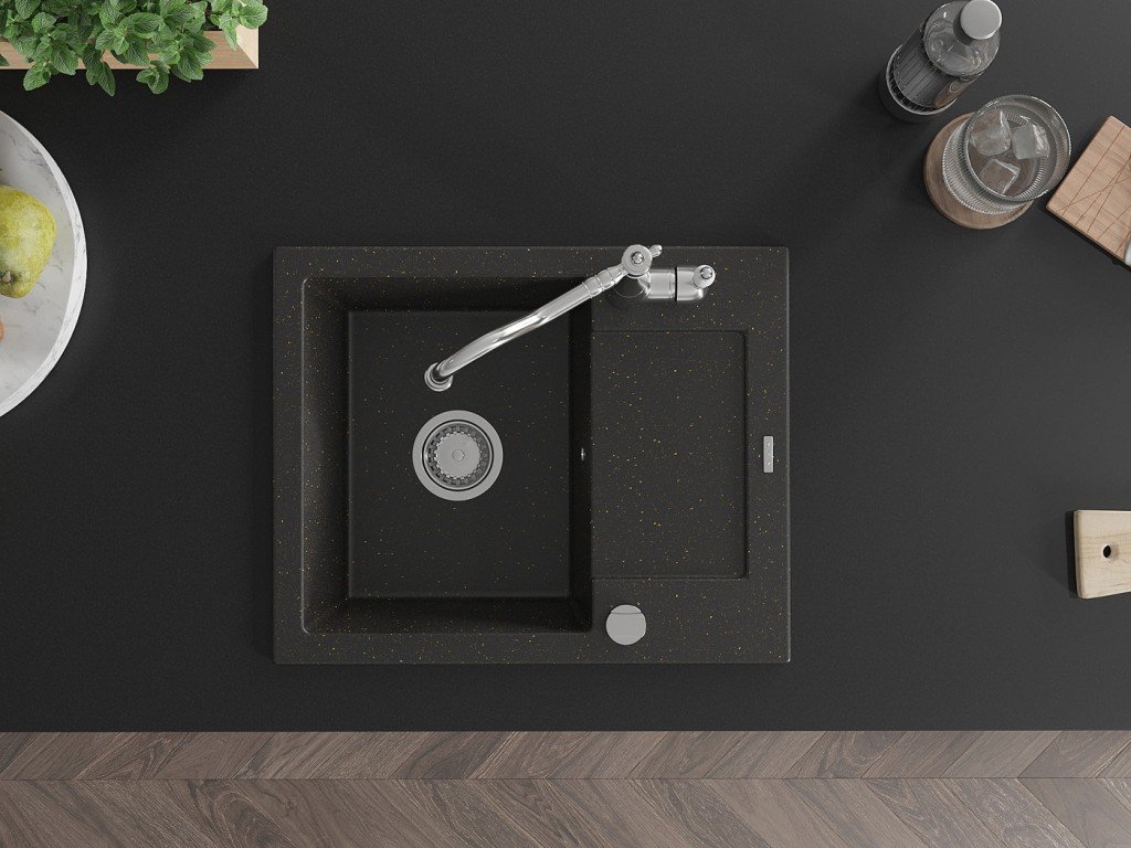 MEXEN/S - Enzo granitový dřez 1 s odkapávačem včetně baterie Carla, černá/zlatá metalik 6506-75-670700-00