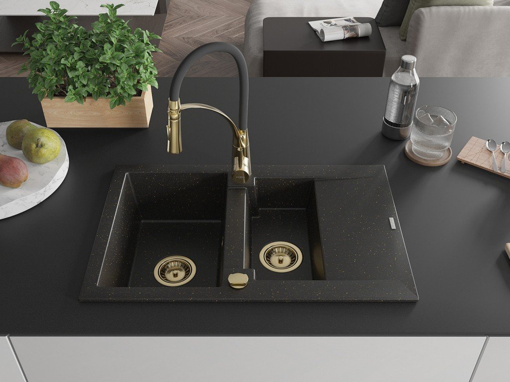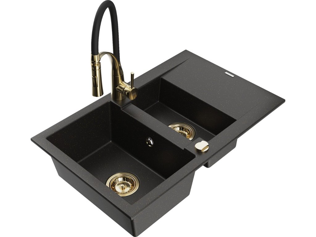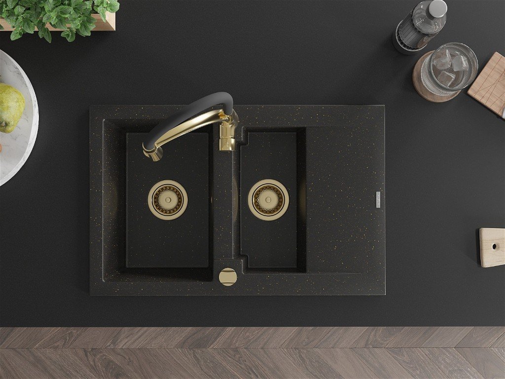 MEXEN/S - Gaspar granitový dřez 1.5 s odkapávačem včetně baterie Aster, černá/zlatá metalik 6507-75-73450-57-G