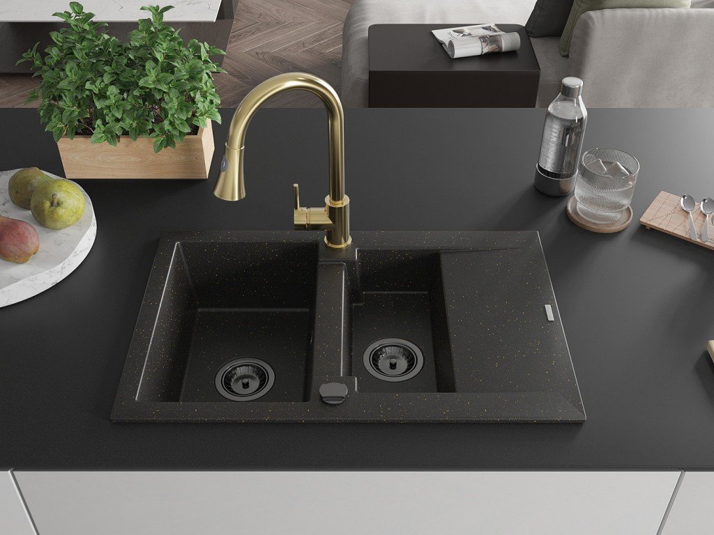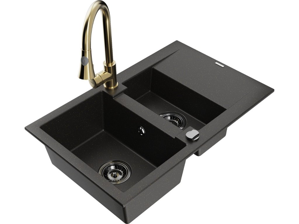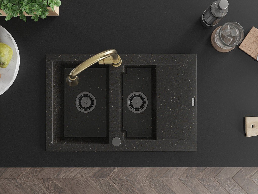 MEXEN/S - Gaspar granitový dřez 1.5 s odkapávačem včetně baterie Elia, černá/zlatá metalik 6507-75-670101-50-B