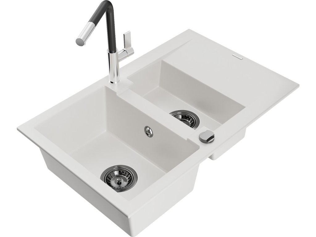 MEXEN/S - Gaspar granitový dřez 1.5 s odkapávačem včetně baterie Flora, bílá 6507-20-670401-07-B