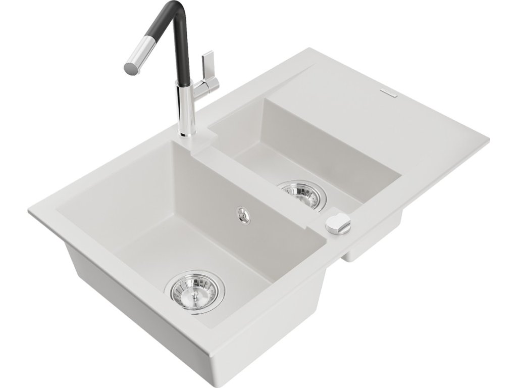 MEXEN/S - Gaspar granitový dřez 1.5 s odkapávačem včetně baterie Flora, bílá 6507-20-670401-07