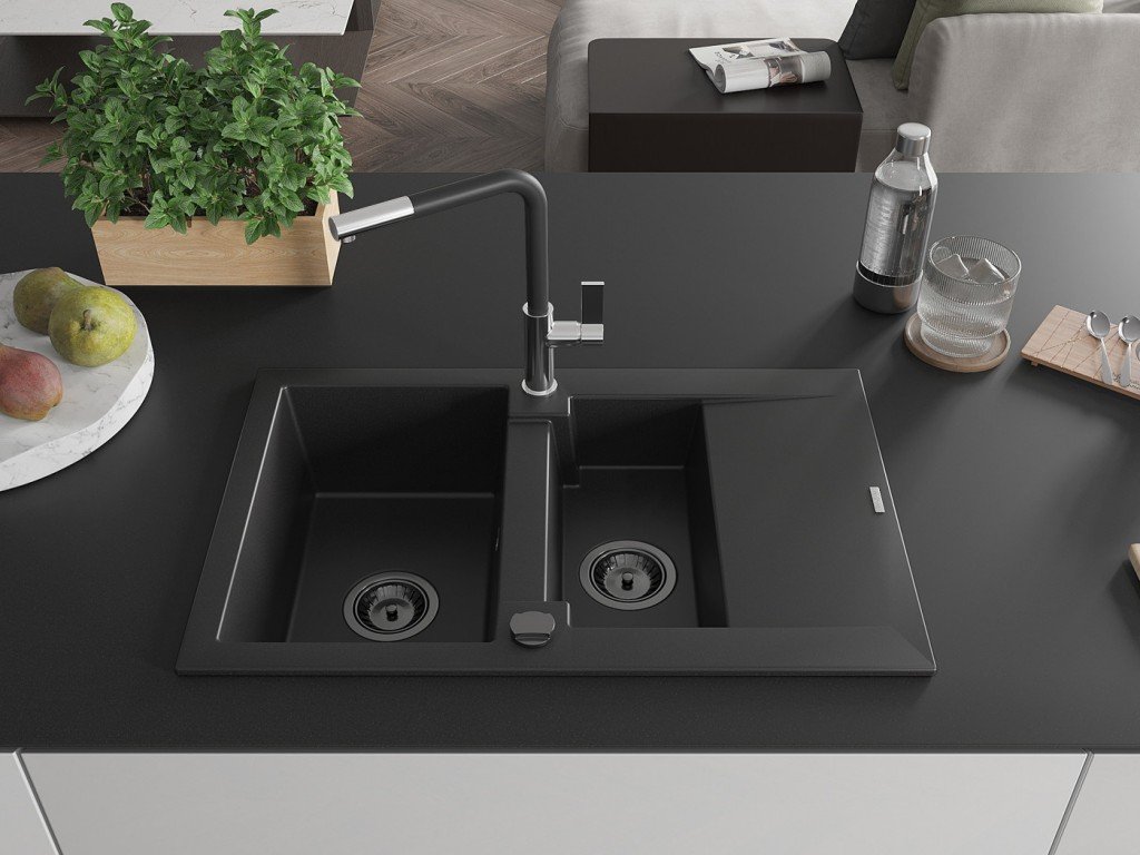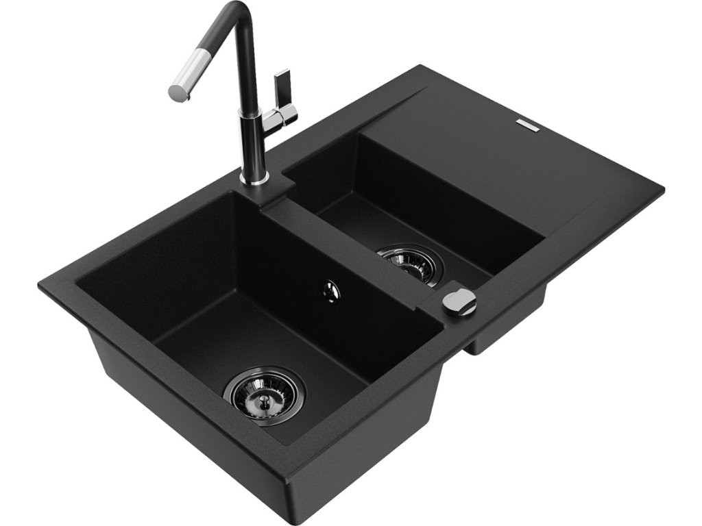 MEXEN/S - Gaspar granitový dřez 1.5 s odkapávačem včetně baterie Flora, černá 6507-77-670401-07-B
