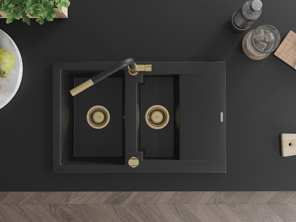 MEXEN/S - Gaspar granitový dřez 1.5 s odkapávačem včetně baterie Flora, černá 6507-77-670401-57-G
