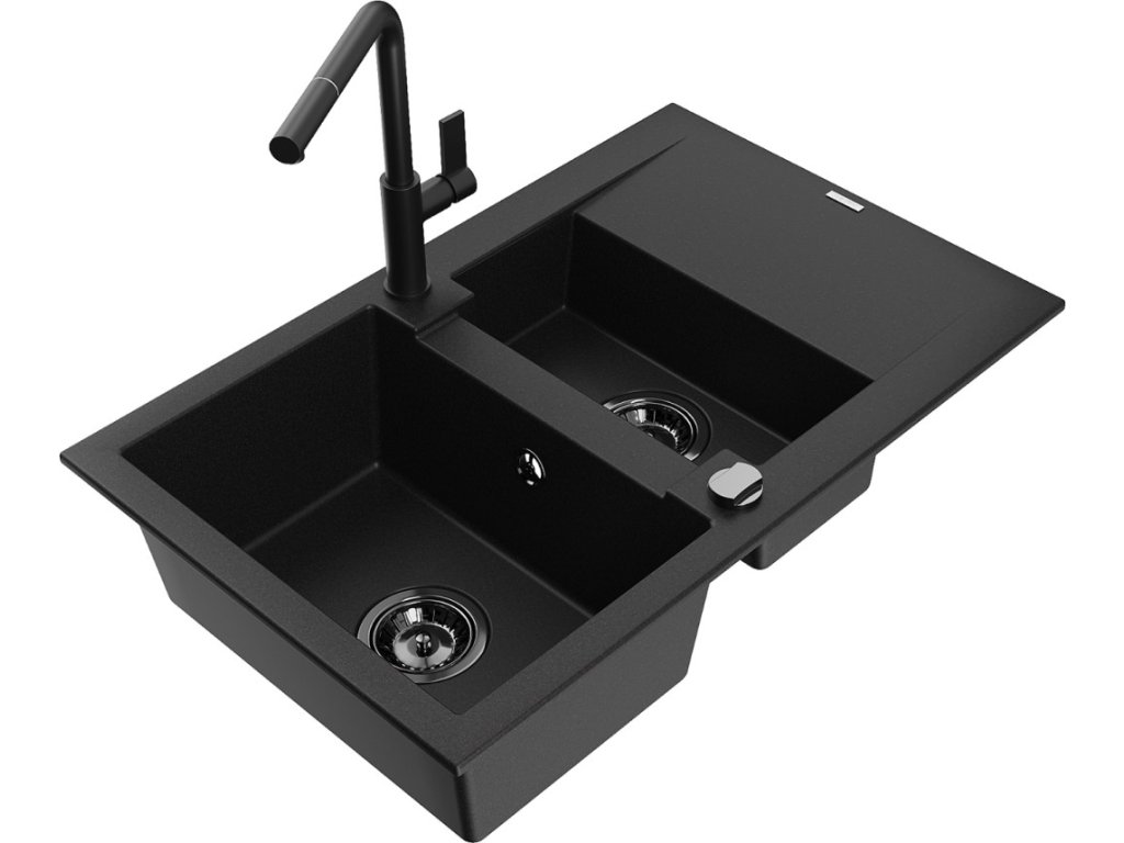 MEXEN/S - Gaspar granitový dřez 1.5 s odkapávačem včetně baterie Flora, černá 6507-77-670401-70-B