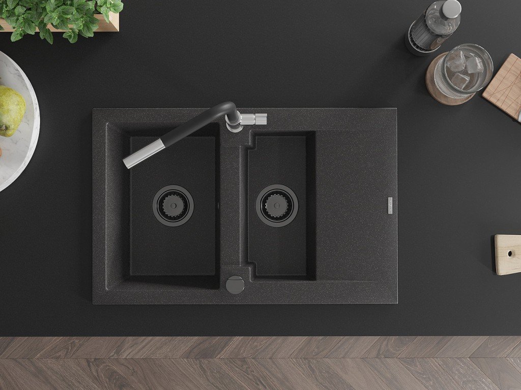 MEXEN/S - Gaspar granitový dřez 1.5 s odkapávačem včetně baterie Flora, černá kropenatá 6507-76-670401-07-B