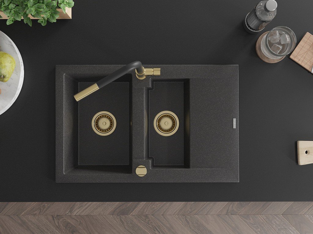 MEXEN/S - Gaspar granitový dřez 1.5 s odkapávačem včetně baterie Flora, černá kropenatá 6507-76-670401-57-G
