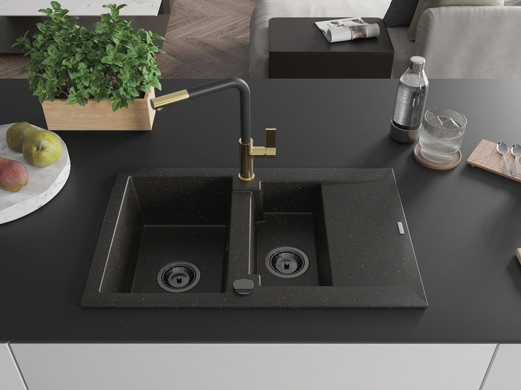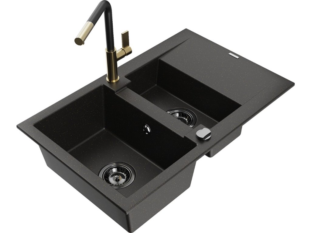 MEXEN/S - Gaspar granitový dřez 1.5 s odkapávačem včetně baterie Flora, černá/zlatá 6507-75-670401-57-B