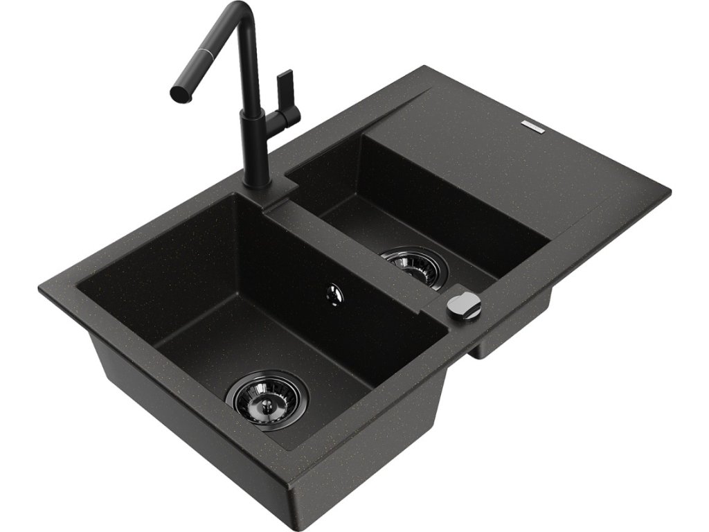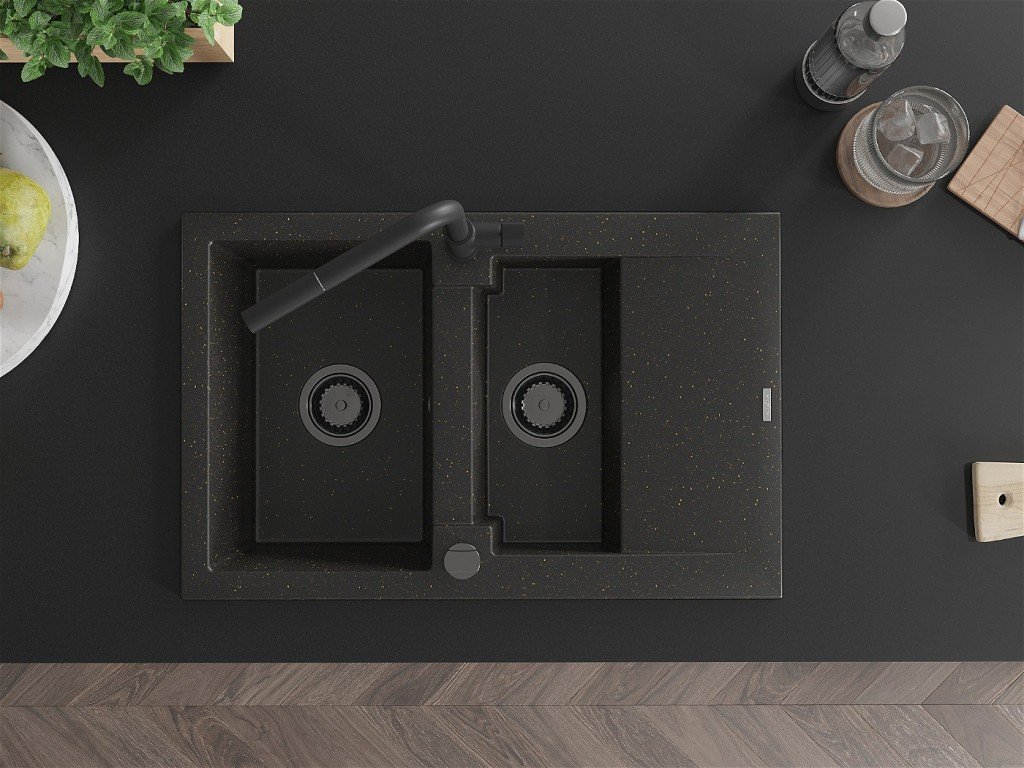 MEXEN/S - Gaspar granitový dřez 1.5 s odkapávačem včetně baterie Flora, černá/zlatá 6507-75-670401-70-B
