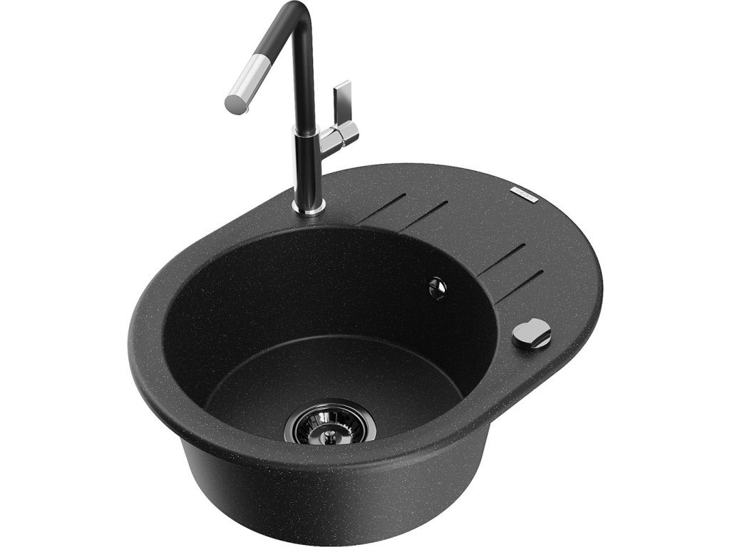 MEXEN/S - Kevin granitový dřez 1-miska s odkapávačem včetně baterie Flora, černá/srebrny metalik 6517-73-670401-07-B