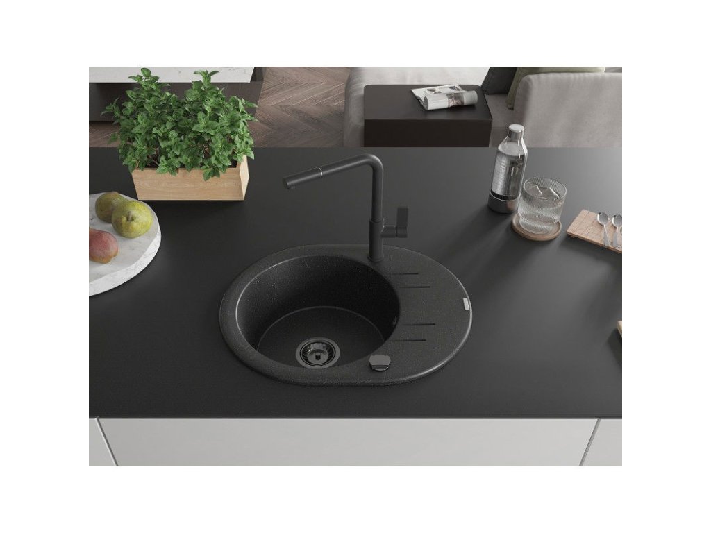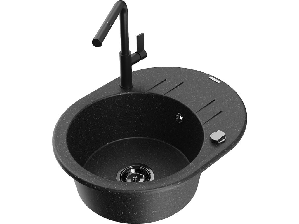 MEXEN/S - Kevin granitový dřez 1-miska s odkapávačem včetně baterie Flora, černá/srebrny metalik 6517-73-670401-70-B