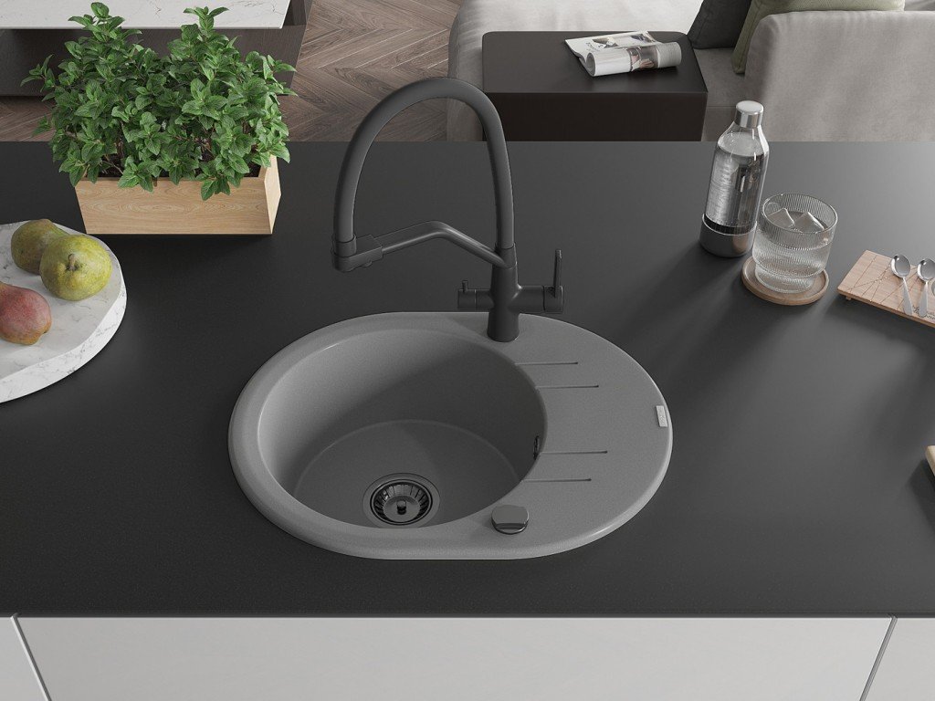 Kuchyňský granitový dřez odolný vůdči poškrábání, teplotním šokům a nárazům. Směs přírodní pryskyřice a hustého granitu.